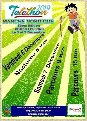 Départ à 9h 15, échauffement à 9h Ravitaillement commun sur le circuit. L’accueil des participants se tiendra à la salle des arcades le vendredi à partir de 19h et le samedi à partir de 7h 30. Une participation forfaitaire de 10€ par personne est demandé, qui donnera droit à une crêpe et à une boisson au village TELETHON. Infos par mail : mncuges@orange.fr ou par téléphone au 06 20 92 18 12. Infos et inscriptions en allant sur le site du club |